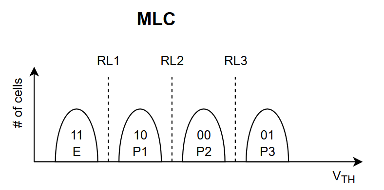 上面讲到的Cell只有 “1” 和 “0” 两种状态,仅需 1 个阈值电压就能区分 2 种状态,这种存储方式叫做SLC(单层单元, Single-Level Cell)